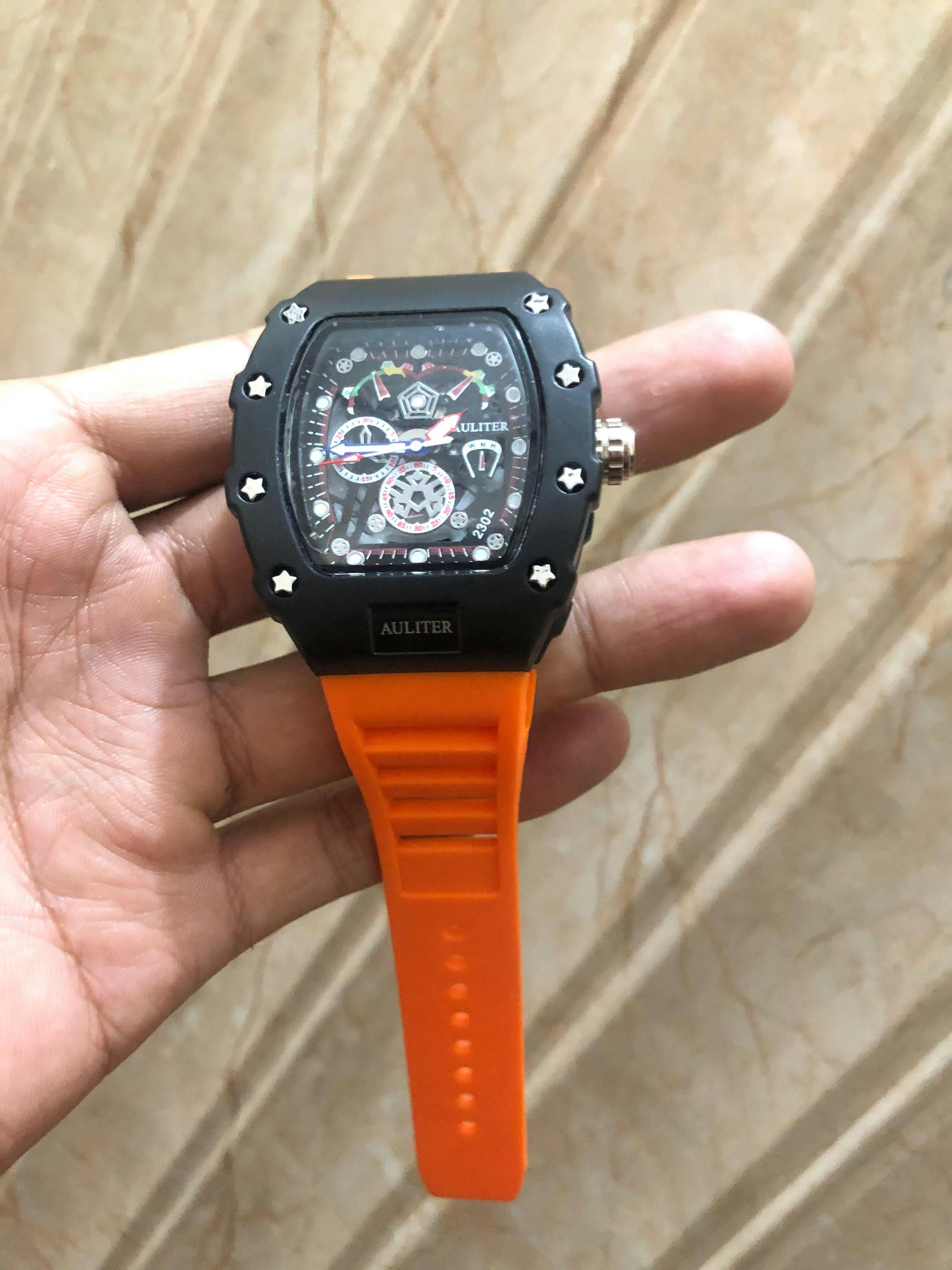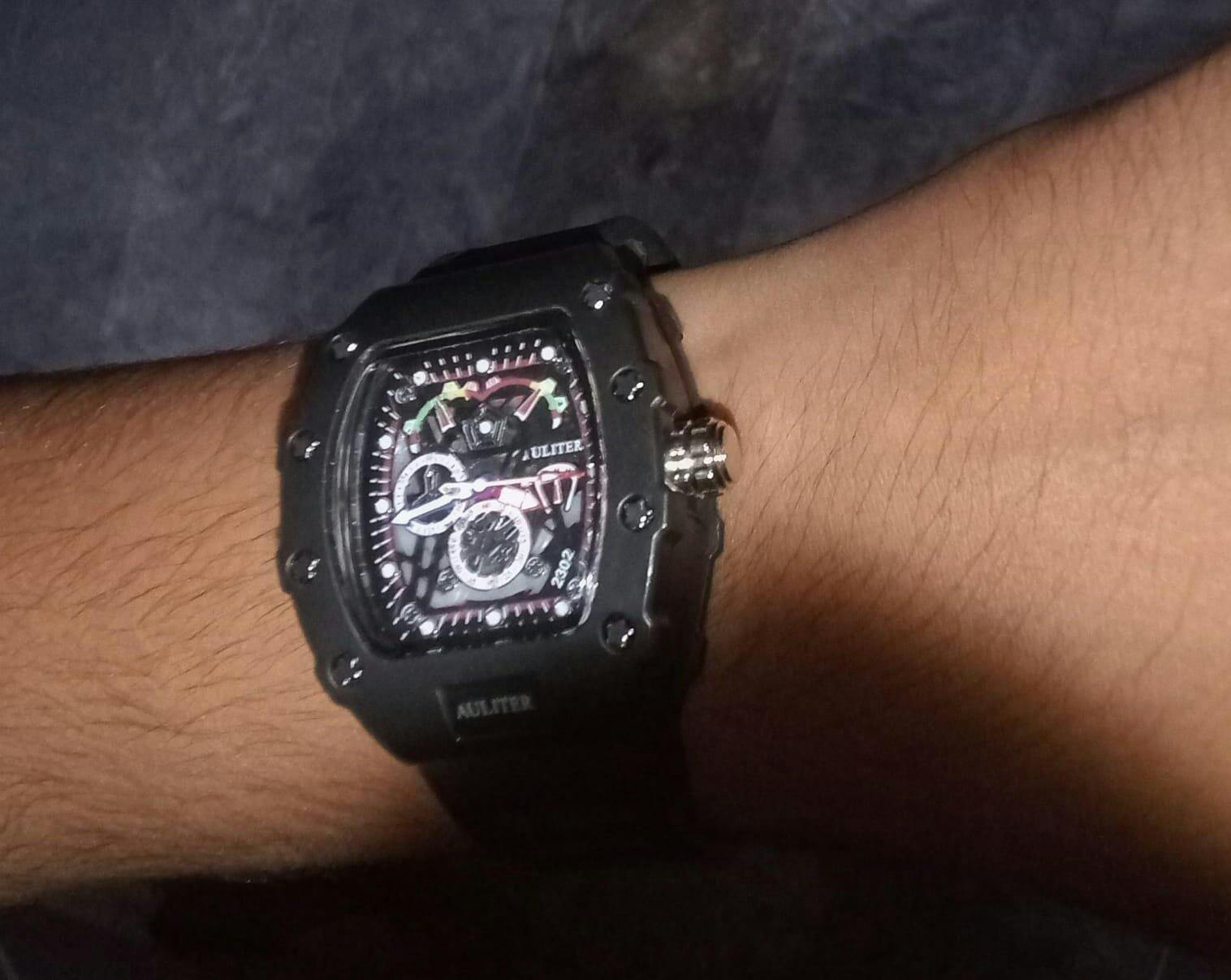 Crafted for men who live fast and look sharp, this timepiece showcases a transparent skeleton dial that reveals the watch’s bold inner mechanism — a true statement of strength and style.